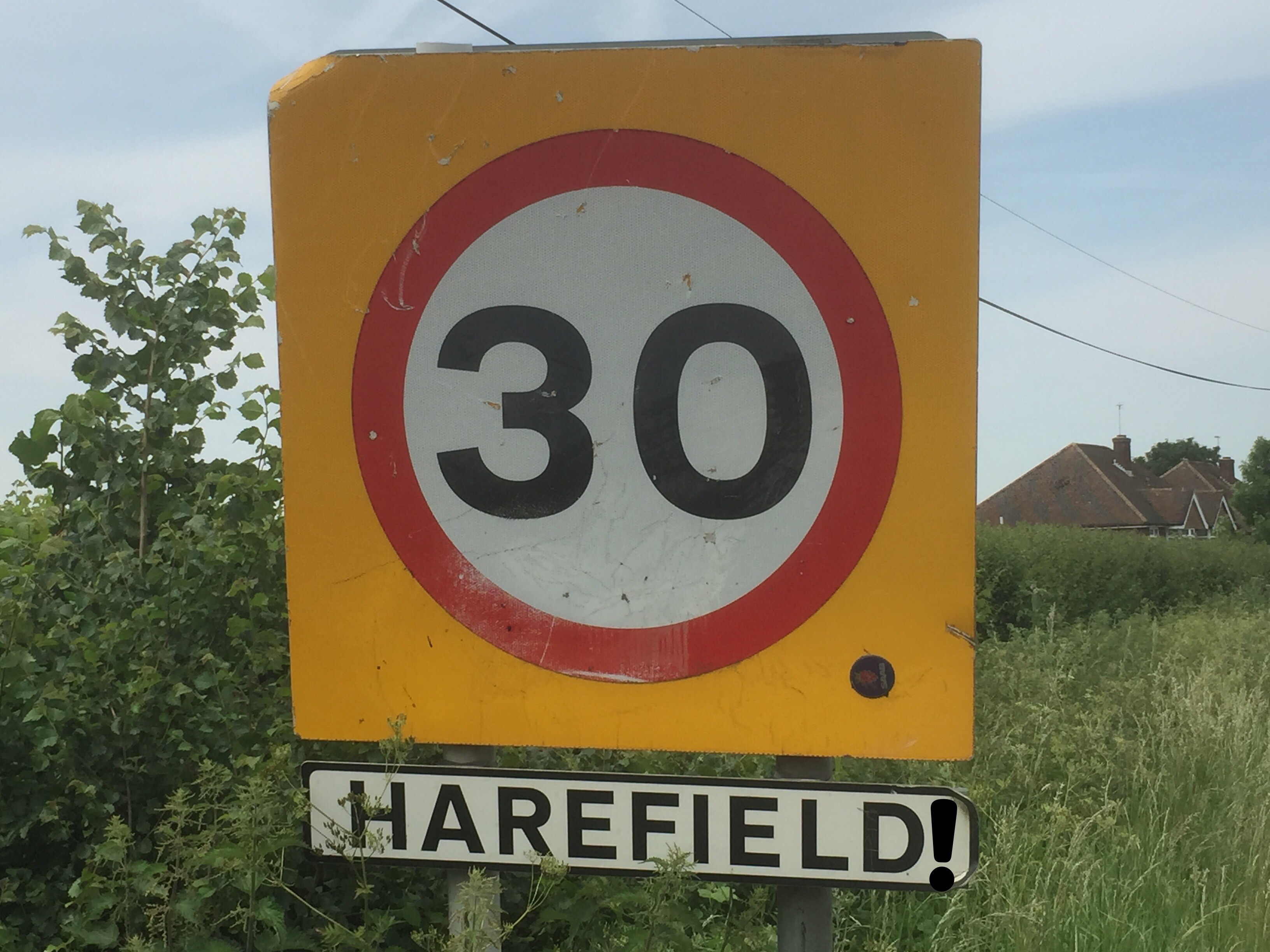 The Harefield! and District Rural Council have decreed a day off for all villagers when a new road sign with the exclamation mark is to be unveiled by a guest celebrity, hopefully an England footballer after winning the Euro 2016 Championship. Or failing that, Bobby Davro.